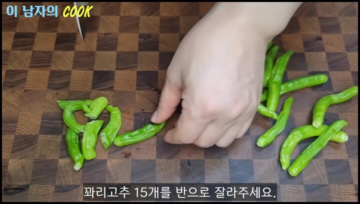 대파 2대는 큼직하게 어슷 썰기 해 줍니다. 꽈리고추 15개를 준비해서 반으로 갈라줍니다. 꽈리고추의 식감과 맛이 돼지갈비찜을 더욱 맛있게 합니다. 꽈리고추 대신 청양고추 3개나 풋고추 4~5개를 넣어도 됩니다.