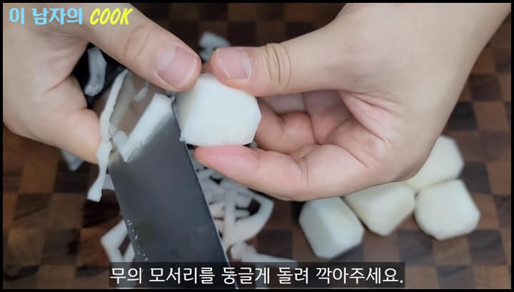 돼지갈비의 핏물을 빼는 동안 부재료를 준비합니다. 무 400g을 준비해서 계란 정도의 크기로 잘라줍니다. 무 대신 감자나 고구마를 넣어도 되지만 되도록이면 무를 준비하는 것이 좋습니다. 무는 모서리를 둥글게 돌려 깎기 해 줍니다.