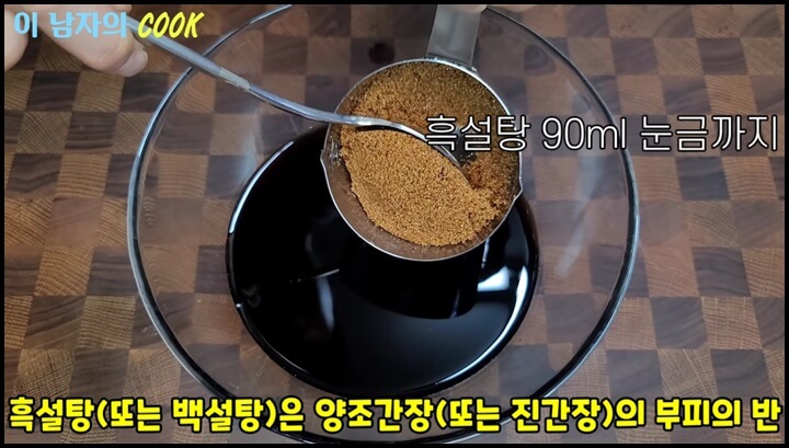흑설탕은 양조간장 부피의 반, 90ml 를 넣어주면 됩니다.