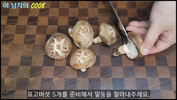 돼지갈비찜의 맛을 더욱 맛있게 만들어 줄 재료가 표고버섯인데요, 표고버섯은 5개 이상 준비해서 밑동을 잘라내줍니다. 그리고 갓 부분을 키친 타올로 물기를 닦아줍니다.