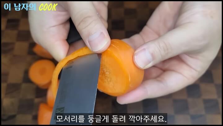 당근도 무와 비슷한 크기로 잘라서 돌려깍기 해 줍니다. 이렇게 모서리를 돌려 깎기 해 주면 잘 부서지지 않습니다.