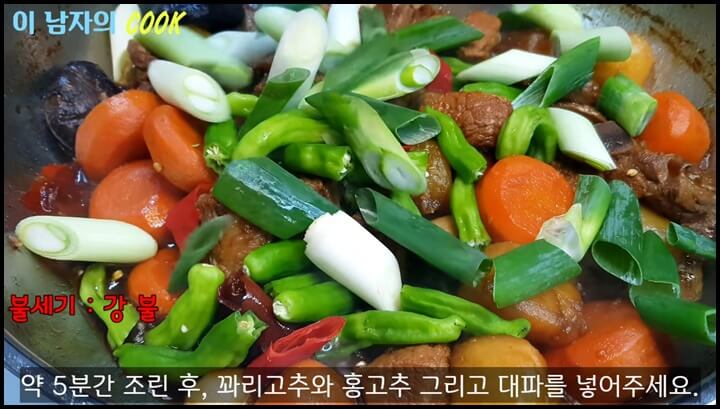 5분간 조린 후 국물이 자박해지면 꽈리고추와 홍고추, 대파를 모두 넣어줍니다. 약 1분 정도 섞으면서 조린 후 불을 끕니다.