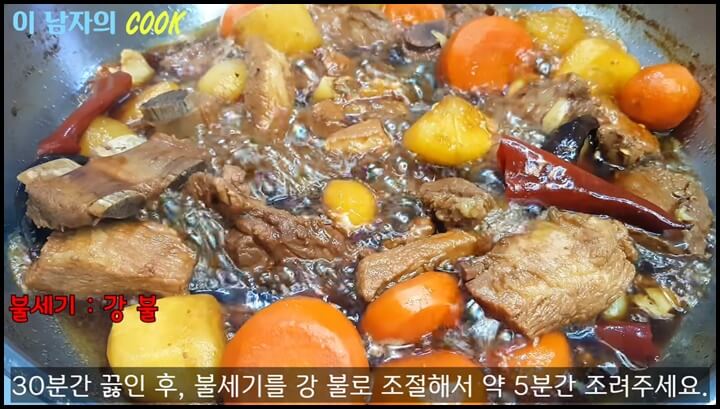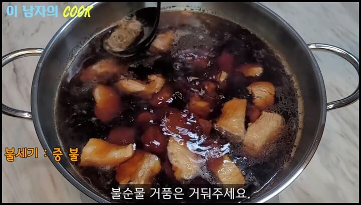 불에 올려 끓이다가 양념이 끓어오르면 중불로 낮춰서 40분간 끓여줍니다. 불순물 거품은 중간중간 걷어냅니다. 이렇게 오래 끓여주면 고기의 육질이 연하고 부드러워집니다.