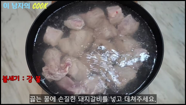 손질한 돼지갈비는 끓는 물에 한번 데쳐 줍니다. 이렇게 초벌로 데쳐주면 고기 표면에 남아있던 불순물과 핏물을 한번 더 제거할 수 있습니다.