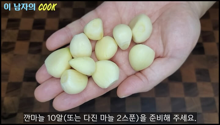깐 마늘 10알도 준비합니다. 깐 마늘 대신 다진 마늘 2스푼으로 준비해도 괜찮습니다. 하지만 깔끔한 돼지갈비찜을 위해서는 깐 마늘이면 더 좋습니다.
