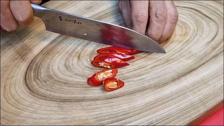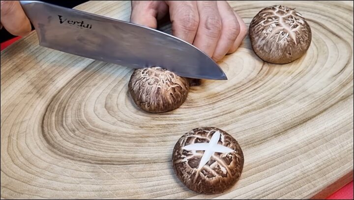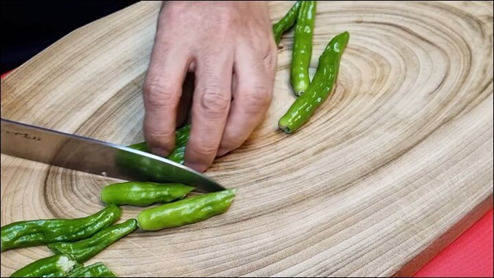 돼지갈비를 끓이고 졸이는 동안 야채를 손질합니다. 대파 1대는 어슷썰기 하고, 꽈리고추는 반으로 잘라주세요. 홍고추는 고명용으로 사용할 것이니 어슷 썰어주고요, 생 표고버섯은 윗면에 칼집을 넣어 모양을 내줍니다.