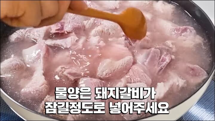 냄비에 물을 넣고 팔팔 끓입니다. 물 양은 돼지갈비가 잠길 정도로 넣어주면 되고, 물이 팔팔 끓을 때 깨끗이 씻어 둔 돼지갈비를 넣어줍니다.