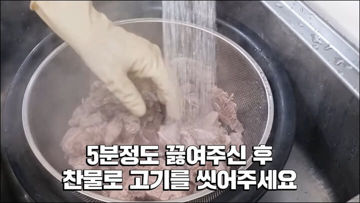 5분 정도 끓어준 후 체에 밭쳐서 건져내고 찬물에 깨끗이 씻어줍니다. 돼지갈비를 하나씩 깨끗이 씻으면서 돼지갈비에 붙은 찌꺼기와 뼛가루 등을 깨끗이 제거해주도록 해요.