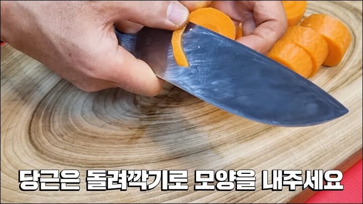 당근은 적당한 크기로 썰어서 가장자리를 깍아서 모양을 내주도록 합니다. 이렇게 모서리를 잘라서 둥글게 하면 돼지갈비찜을 끓이는 동안 부서지지 않고 모양을 유지할 수 있어요. 무도 적당한 크기로 잘라 돌려 깎기 해 줍니다.