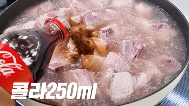 그리고 콜라 250ml를 넣어줍니다. 콜라를 넣어주면 돼지고기 특유의 냄새를 잡아줄 수 있다고 해요.