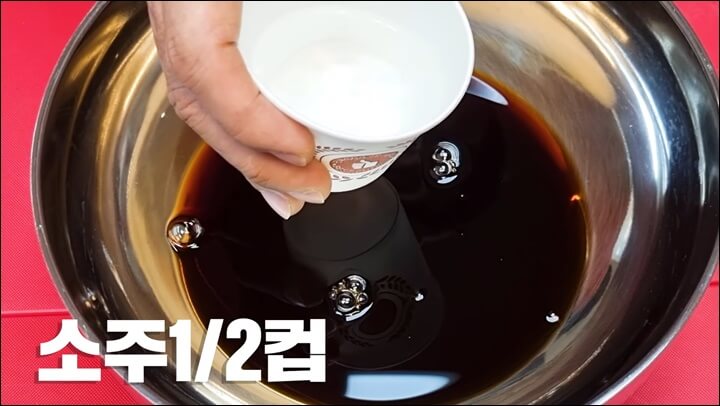 돼지갈비찜 맛있게 만드는 법에 필요한 양념장을 만들어요. 진간장 1컵 160ml, 소주 종이컵 반컵, 콜라 250ml, 흑설탕 종이컵 반 컵을 넣고 살짝 저어줍니다.