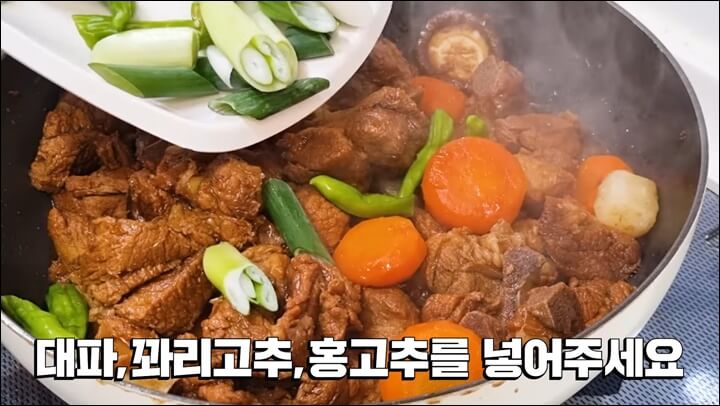돼지갈비찜 맛있게 만드는 법의 마지막 단계예요. 30분 정도 약불에 졸인 후 뚜껑을 열어보면 국물이 적당히 졸여져서 아주 맛있어 보이는 비주얼이 나와요. 살짝 뒤적여준 다음 대파, 꽈리고추, 홍고추를 넣고, 물엿 1스푼도 넣어줍니다. 후추 2꼬집도 넣은 후 살짝 뒤적여주세요.