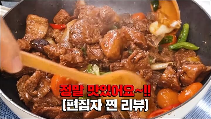 그런 다음 뚜껑을 닫고 마지막으로 약불에서 10분간 더 졸여줍니다. 10분을 졸인 후 참기름 1스푼과 통깨 1스푼을 뿌려서 살살 섞어주면 돼지갈비찜 완성입니다. 총 1시간 10분을 졸여낸 돼지갈비찜입니다. 맛있어 보이는 비주얼이 예술입니다. 편집자님이 정말 맛있다고 찐 리뷰를 남겨주셨네요!!