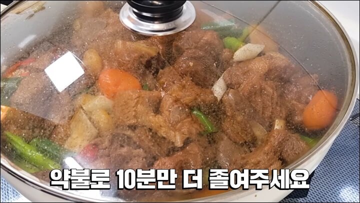 뚜껑을 닫아 약불로 줄여서 30분 정도 뭉근하게 졸여줍니다. 이렇게 약불로 뭉근히 졸여주면 돼지갈비가 연하고 맛있어져요.