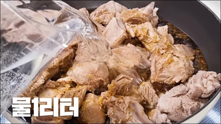 이제 냄비에 돼지갈비와 양념을 넣고 끓여가며 졸여주면 되는데요, 냄비에 손질한 돼지갈비와 양념장을 모두 넣어줍니다. 그리고 물 1리터를 부어 줍니다. 1시간 정도 끓이면서 졸여주어야 하니 물은 돼지갈비가 잠길 정도로 충분히 넣어줍니다.