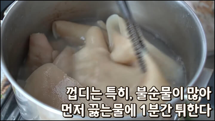 돼지껍데기는 잘 삶아야 누린내도 나지 않고 질기지 않도록 맛있게 먹을 수 있습니다.
