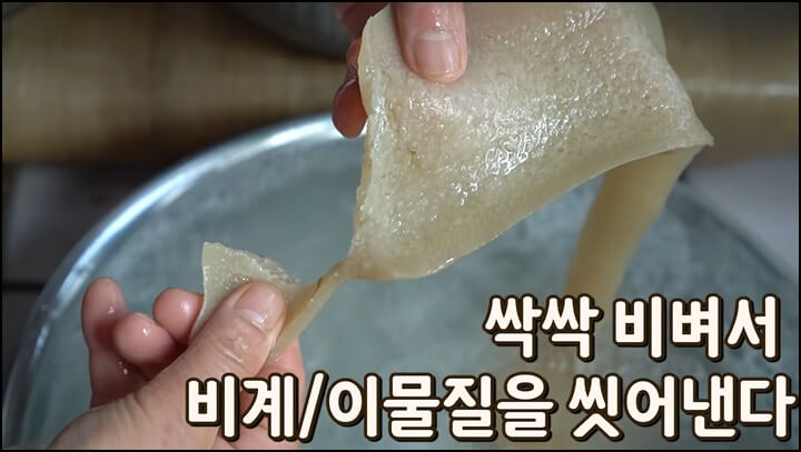 삶아낸 돼지껍데기는 찬물에 씻어주는데 싹싹 비벼가며 비계와 이물질들을 깨끗이 씻어냅니다.