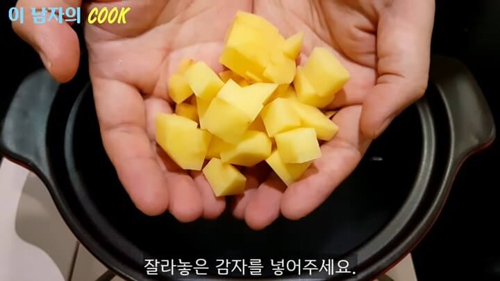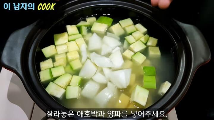 물을 넣은 다음 익는데 시간이 다소 오래 걸리는 감자를 넣어줍니다. 그리고 오래 끓일수록 맛이 나는 애호박과 단맛이 나는 양파도 같이 넣어줍니다.