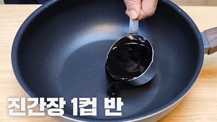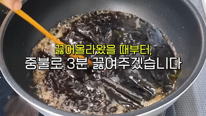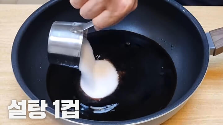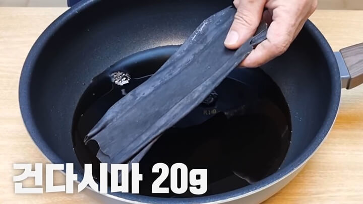 냄비에 진간장 1컵 반을 넣어줍니다. 계량컵 160ml 기준이에요. 물 1컵, 설탕 1컵을 넣고 잘 저어가며 설탕을 녹여주세요. 그리고 건다시마 20g을 넣고 불을 켜서 끓여줍니다.