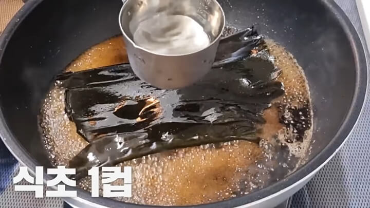 끓어오르기 시작하면서부터 중불로 3분간 끓여줍니다. 3분간 끓여준 후 식초 1컵을 넣어줍니다. 식초는 처음부터 넣으면 산화가 되니 늦게 넣는 것이 좋아요. 그리고 소주 1컵도 넣어줍니다.