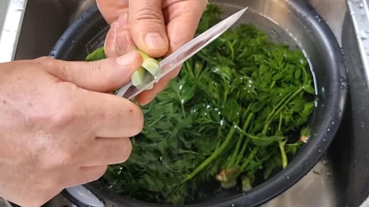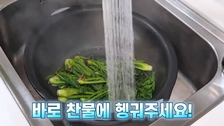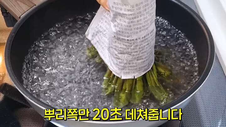 뿌리 20초, 전체 40초 데쳐서 총 1분간 데친 후 건져서 찬물에 바로 헹궈주세요. 두어 번 찬물에 헹궈주며 깨끗이 씻어주고 열기도 식혀주세요.