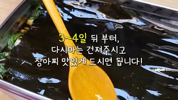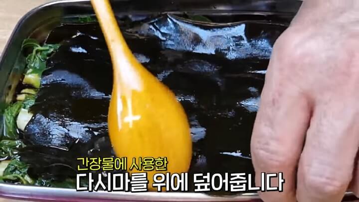 간장물을 부어준 다음 간장물 끓일 때 사용했던 다시마를 두릅 위에 덮어줍니다. 다시마는 3~4일 뒤에 맛있는 맛이 다 빠진 다음 걷어내면 되고, 그때부터 두릅 장아찌를 먹으면 됩니다.