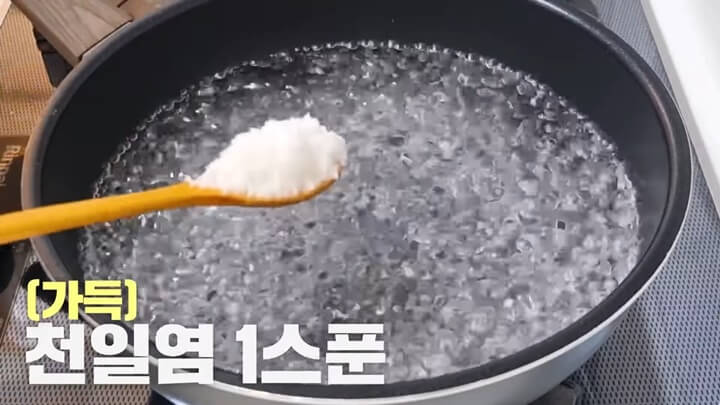 물이 끓고 있을 때 천일염 가득 1스푼을 넣고 충분히 소금이 녹도록 저어주세요.