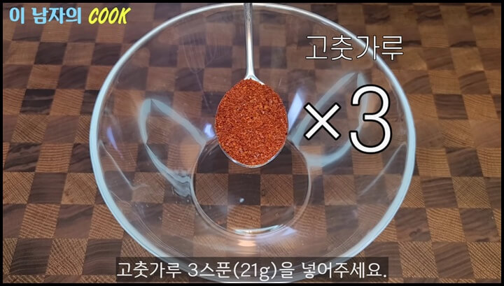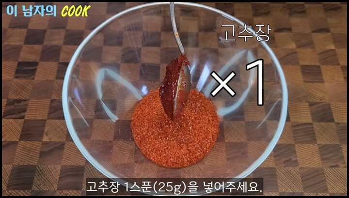 1) 고춧가루 3스푼을 넣고, 고추장 1스푼을 넣어줍니다.