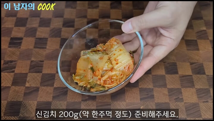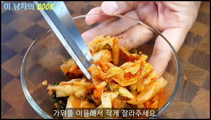 3) 두부조림, 두부두루치기를 더욱 맛있게 해 줄 신김치 200g을 잘게 잘라줍니다. 가위로 잘게 잘라주세요.