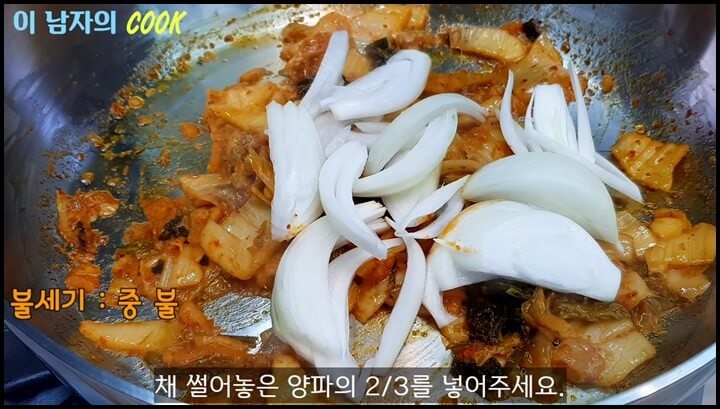 3) 김치가 볶아졌으면 양파 썰어둔 것 2/3만 넣어줍니다.