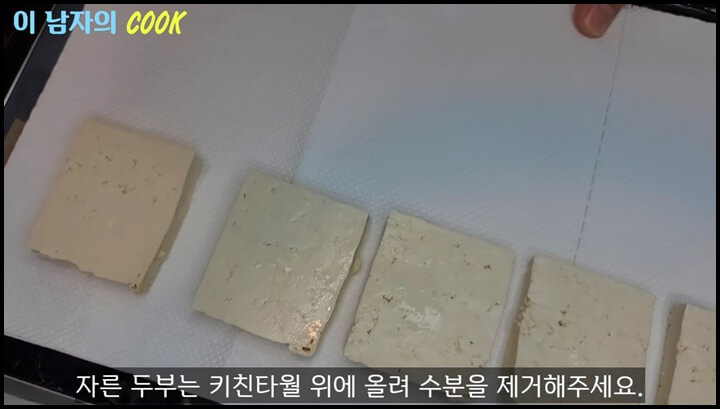 3) 자른 두부를 키친 타올에 올려 수분을 빼 줍니다.
