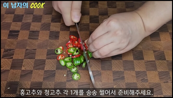 2) 청고추, 홍고추는 각각 1개씩 송송 썰어줍니다. 매운맛을 위해 청양고추를 넣어도 좋습니다.
