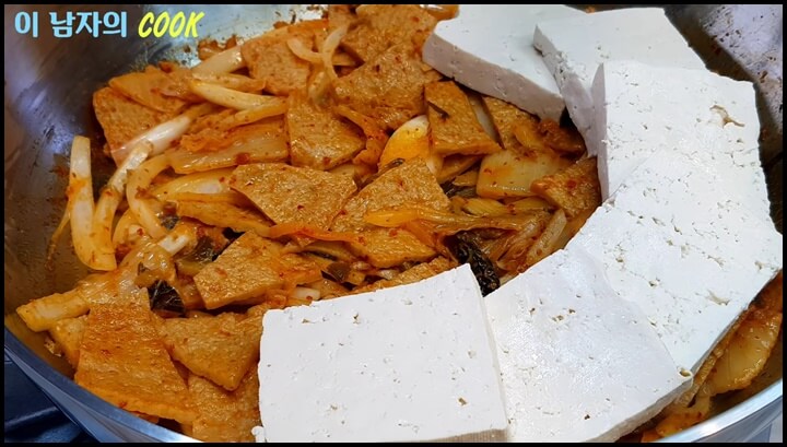 1) 김치와 어묵 볶은 것 위에 두부를 가지런히 올려줍니다. 두부에 양념이 잘 배도록 넓고 고르게 펴서 올려줍니다.