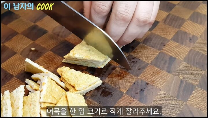 4) 두부조림, 두부두루치기를 더욱 맛있게 해 줄 두번째 재료는 어묵입니다. 어묵 2장을 준비해서 한 입 크기로 잘라줍니다.