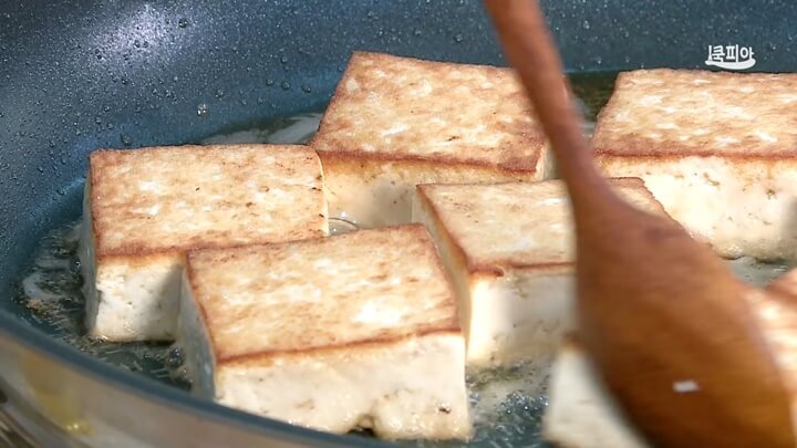 두부의 한 면당 2~3분 정도 충분히 익혀줍니다. 한 면이 노릇하게 구워졌으면 뒤집어서 다른 면도 같이 노릇하게 구워줍니다.