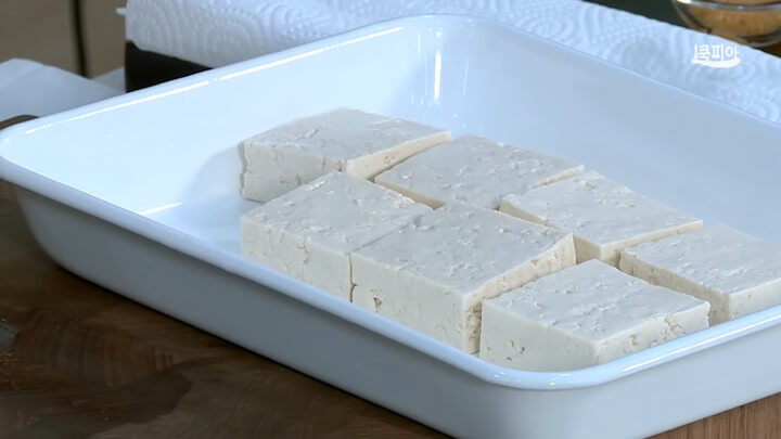 정사각형으로 자른 두부는 잘려진 안쪽면이 위로 가도록 쟁반에 놓아줍니다. 두분의 겉면은 더러 굳은 부분도 있기 때문에 밑간을 할 때 잘 스며들지 않으니 안쪽 면을 위로 놓아 밑간을 해 줍니다.