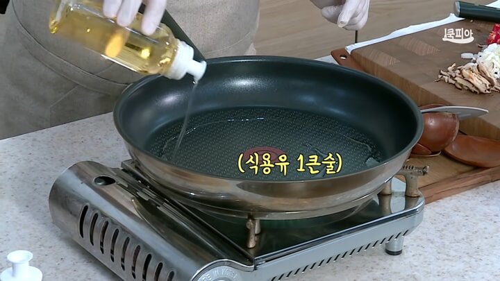 팬에 식용유 1큰술, 들기름 1큰술을 둘러줍니다. 식용유와 들기름을 같이 사용하는 이유는 들기름이나 참기름은 발연점이 160도 밖에 안되기 때문에 발연점이 높은 해바라기유, 카놀라유, 포도씨유와 같은 식용유와 같이 혼합해서 발연점을 높이 끌어올려주는 것이 좋습니다. 들기름을 같이 넣어 구우면 맛도 더 고소하기도 하고요.