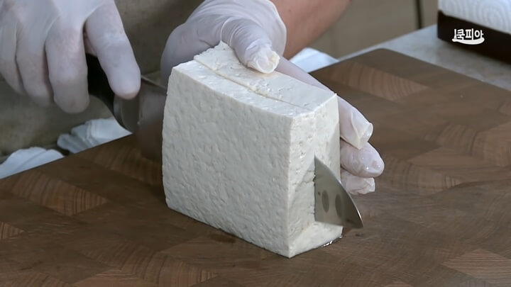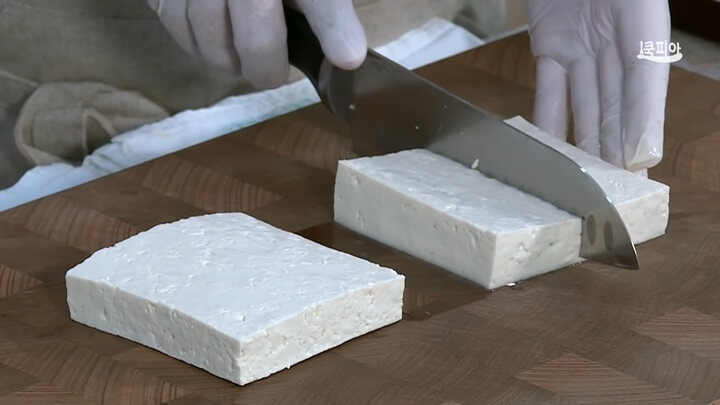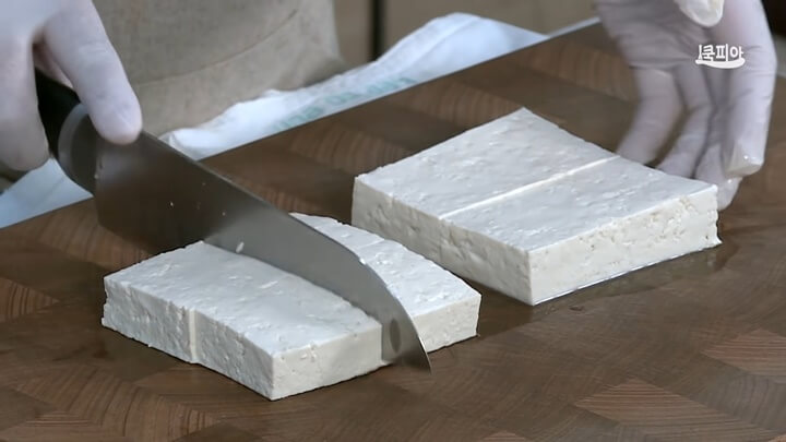먼저 두부를 세로로 세워서 반으로 갈라줍니다. 반으로 자른 두부를 다시 한번 가로 세로 각각 반으로 잘라 8등분으로 만들면 됩니다.