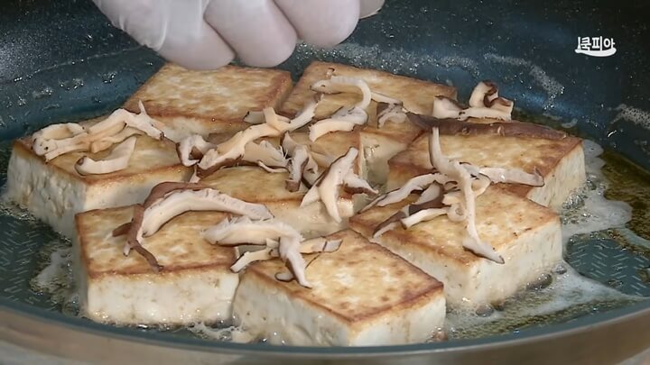 두부가 앞뒤로 다 구워졌으면 채 썬 표고버섯을 두부 위에 올려줍니다. 이렇게 표고버섯을 같이 올려주면 버섯이 씹히면서 표고버섯의 향이 두부에 싸악 스며들어서 더욱 맛있게 느껴집니다.