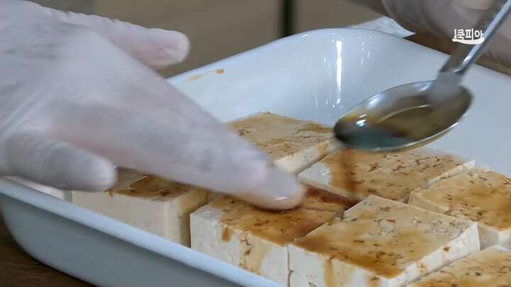 국간장 1큰술을 두부 하나하나에 뿌려가면서 손으로 문질러서 묻혀줍니다.