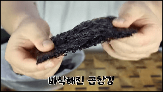 곱창김을 팬에 살짝 구워서 바삭바삭하게 만들어 줍니다. 그런 다음 위생팩에 넣고 가볍게 부숴줍니다.