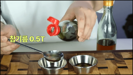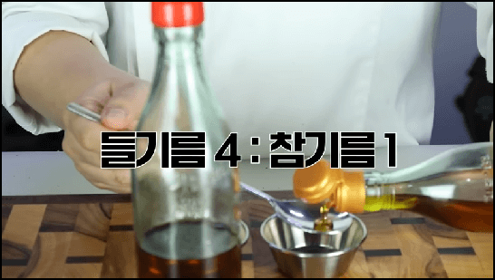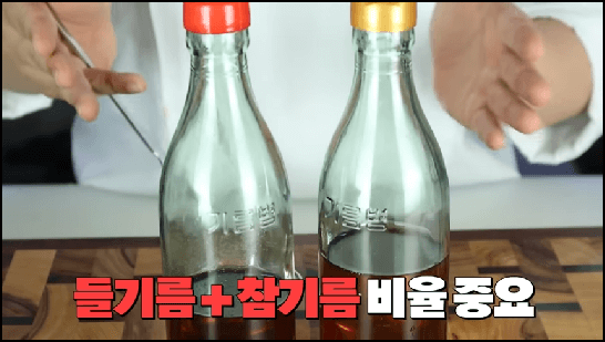 들기름과 참기름의 비율은 4:1로 맞추면 되고, 들기름 2큰술에 참기름 0.5큰술을 넣어 섞어줍니다.