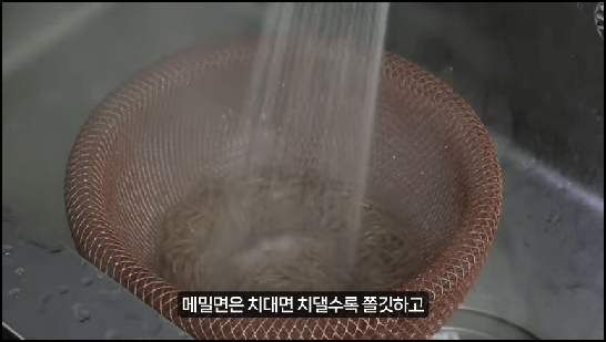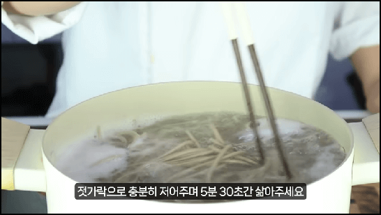 젓가락으로 잘 저어가며 5분 30초간 잘 삶아 준 후 찬물에 헹궈줍니다. 메밀면은 오래 치대면 치댈수록 쫄깃하게 되고, 면이 서로 달라붙는 것을 방지할 수 있습니다.