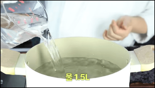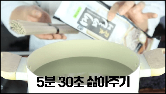 냄비에 물 1.5리터를 넣고 끓인 후 메밀면 200g을 넣고 삶아줍니다. 메밀면 설명서에 나와있는 시간은 6~7분이라고 되어있는데요, 여기에서 1분 줄인 시간 5분 30초를 삶아줍니다. 구입한 메밀면 설명서 시간에서 1분 줄여서 삶아보시면 탱글탱글 맛있는 면을 드실 수 있으니 참고하세요.