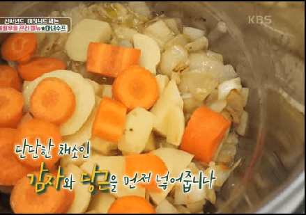 감자는 깨끗이 씻어서 큼직하게 썰고, 당근도 큼직하게 썰어줍니다. 푹 익힐 거라서 야채들이 흐물흐물해지기 때문에 큼직하게 썰어도 괜찮습니다.