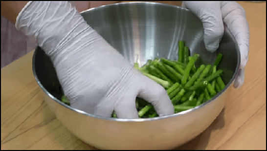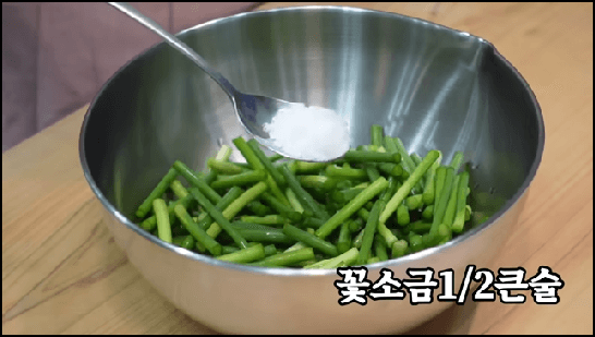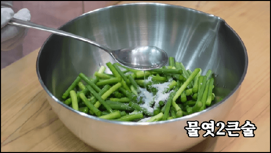 마늘쫑볶음을 쫀득하게 만드는 비결은 마늘쫑을 절여주는 것인데요, 꽃소금 1/2큰술과 물엿 2큰술을 넣고 손으로 잘 버무린 후 30분 정도 그대로 둡니다. 이렇게 30분 정도 절여주면 볶는 시간도 줄고 마늘쫑도 쫀득쫀득 맛있는 식감이 됩니다.