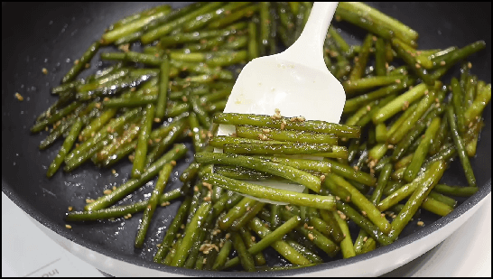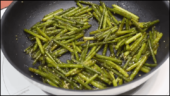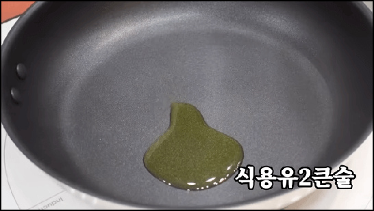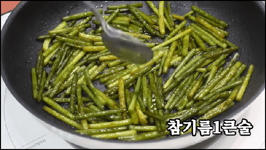 팬에 식용유 2큰술을 넣고 마늘쫑을 모두 넣어서 살짝 볶아줍니다. 이때 불은 중불로 맞추고 표면이 살짝 쪼글거릴 정도로만 볶아주면 됩니다.