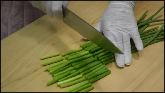 마늘쫑은 가지런히 놓은 후 마늘쫑 씨방부분은 잘라냅니다. 먹어도 상관없지만 식감이 안좋을 수 있으니 잘라내 버리고 아래쪽만 사용합니다. 먹기 좋은 길이로 5~6cm 정도로 잘라주고, 물에 씻어서 물기를 빼 줍니다.
