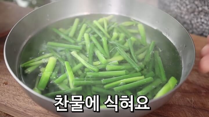 데친 마늘쫑은 건져서 찬물에 담가 식혀줍니다. 찬물에 담갔다가 건져서 물기를 빼 줍니다.