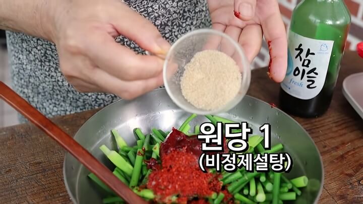 설탕 1숟갈을 넣어줍니다. 물엿을 넣게 되면 나중에 물이 흐르게 되는데 설탕으로 버무려주면 마늘쫑에서 나오는 물을 잡아줄 수 있어요.